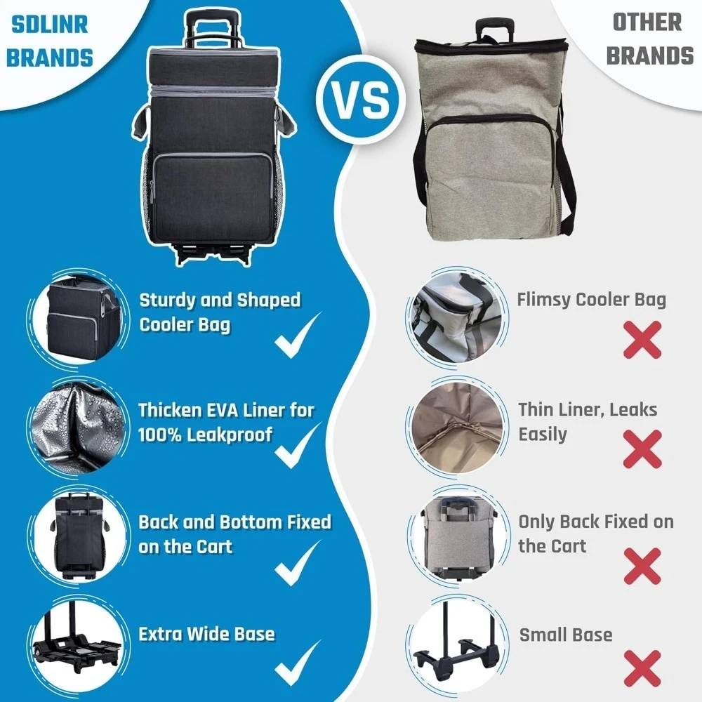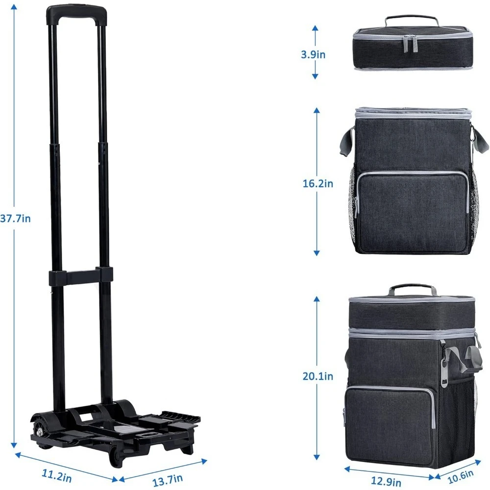STURDY TO ROLL - rolling soft cooler features a detachable cart with extra wide base, all terrain wheels and long telescoping handle, which can extend to 37.7" H and lock into 3 positions, easy pull for both men and women. By attaching the bag backside and bottom to the cart, either empty or full, this wheeled cooler will stand upright and very sturdy.